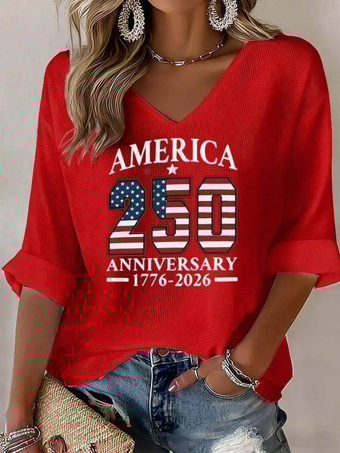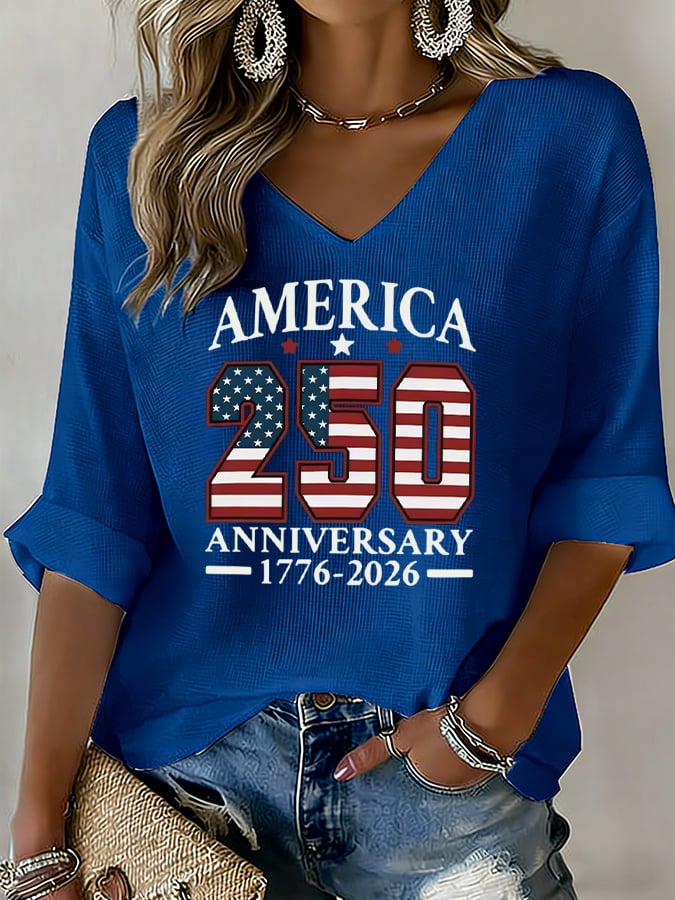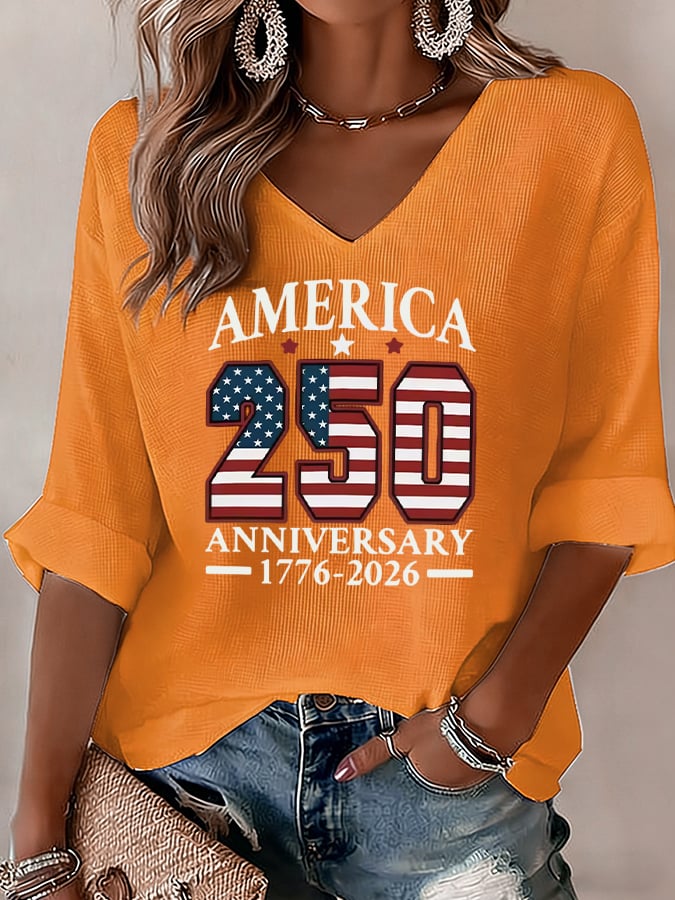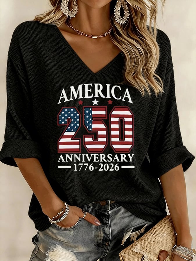 Women's America 250th Anniversary 1776-2026 American Flag Print V-Neck Top