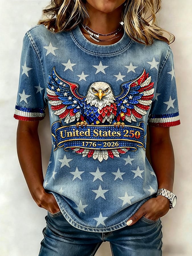 Women's American 250 Retro Distressed Pattern Print Casual Short-Sleeve T-Shirt